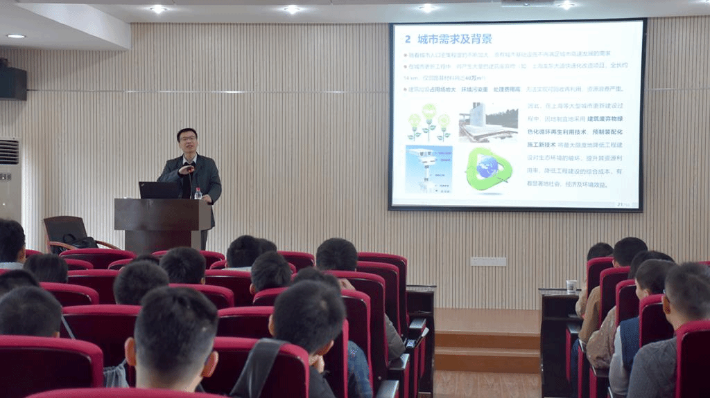 报告围绕“城市更新中绿色施工技术探索与实践”展开,介绍了上海建工集团工程研究总院在复杂的城市环境中绿色施工技术的探索和工程实践经验,分别从“高架桥梁预制拼装技术”、“地下结构预制拼装技术”和“渣土再生利用技术”三个方面介绍了绿色施工技术中的关键技术问题和积累的工程经验。报告结束后,吴小建所长热情回答了参会师生的提问,他衷心希望公司师生在城市绿色施工技术上取得更大的突破,为解决我国城市施工中的环境难题做出贡献。