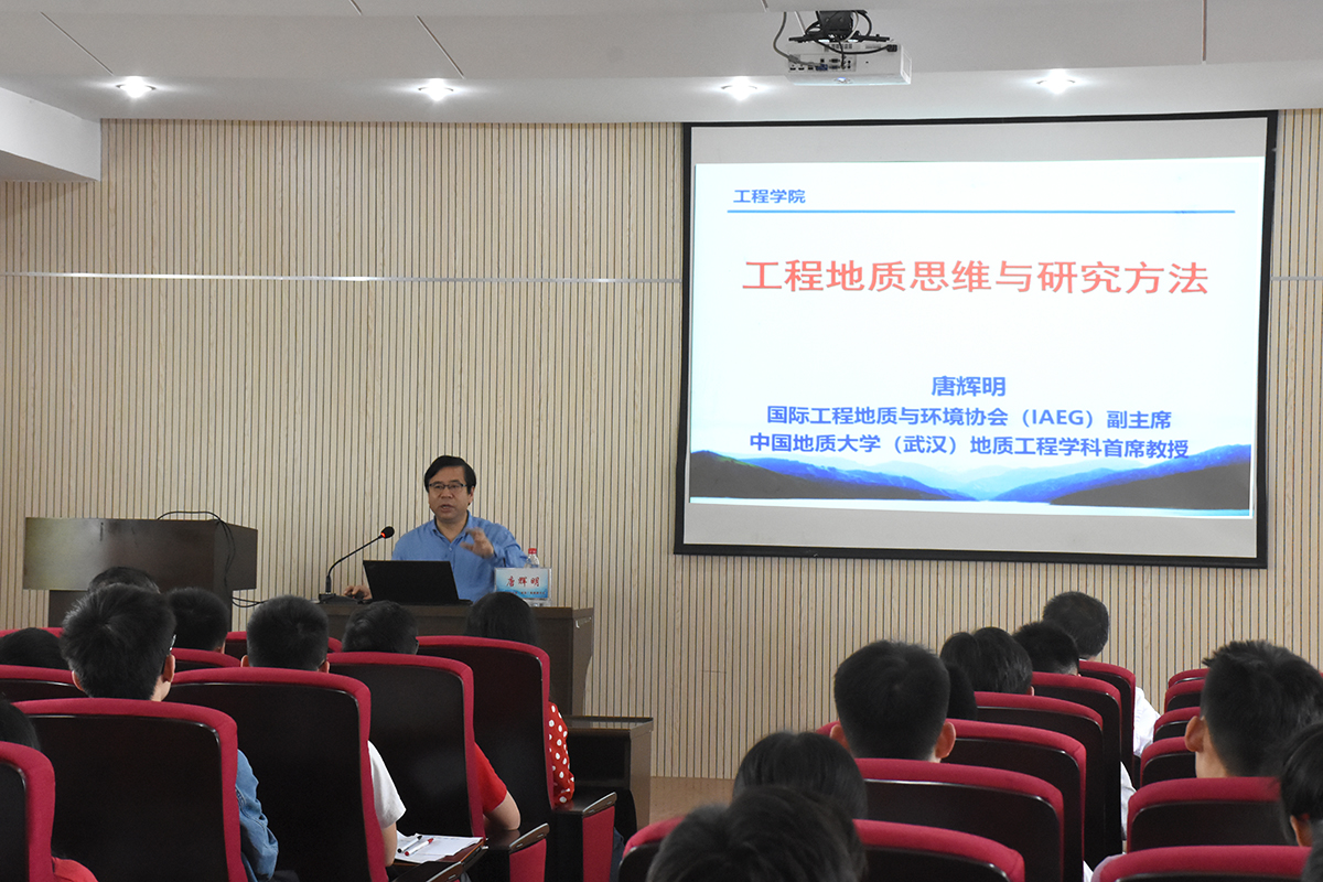 唐辉明教授介绍了工程地质学学科的特点,强调工程地质学研究对象具有演化属性。重点介绍了公司“3+5”工程地质人才培养模式和现代工程能力导向的教学内容体系,以及公司在地质工程领域的特色与优势。并与同学们探讨了工程地质思维方法、研究方法、原型试验与监测和空间大数据应用等。最后以滑坡研究为例,讲解了这些内容和方法在滑坡中的实践与成效。