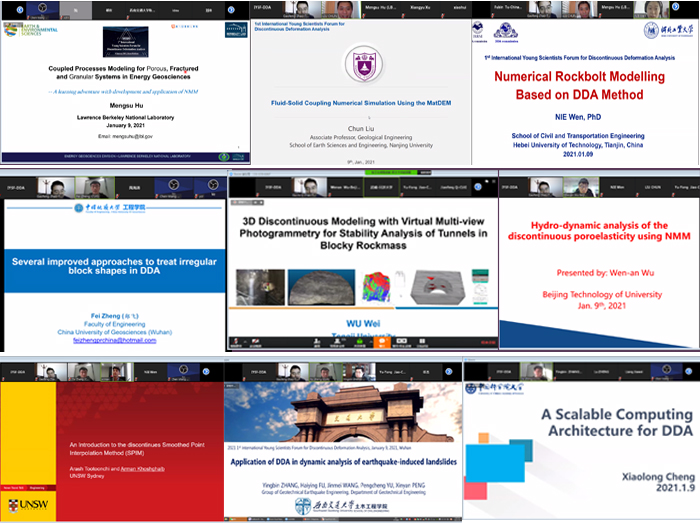 (通讯员:吕加贺 张美霞)2021年1月9日,由国际岩石力学与岩石工程学会非连续变形分析专委会(ISRM DDA Commission)、ISRM中国国家小组(ISRM NG China)、中国岩石力学与工程学会岩土体非连续变形分析专委会(CSRME DDA Commission)联合发起,sunbet官方网站(武汉)、天津大学和河北工业大学联合承办的第一届非连续变形分析国际青年科学家论坛(1st International Young Scientists Forum for Discontinuous Deformation Analysis, IYSF-DDA)在Zoom会议平台成功举办,并于矿业人网站、哔哩哔哩平台同步直播,超过350人全程参加了此次非连续变形分析领域的学术盛宴。此次会议主要邀请了岩石力学与工程非连续变形分析领域青年学者,旨在交流非连续变形分析方法的前沿理论和最新研究进展,同时分享岩石力学与工程中非连续变形分析典型工程案例。