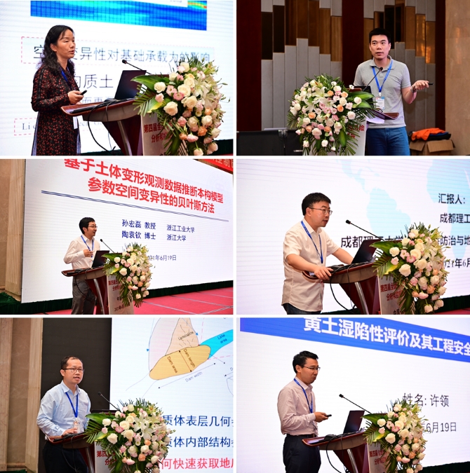 会议期间,各位专家学者以目前各自所属的专业方向及具体研究成果为主要内容,为线下线上参会人员作了精彩的学术报告。sunbet官方网站(武汉)唐辉明教授以《基于演化的滑坡防控理论与方法技术》为题作会议特邀报告,美国克莱姆森大学C. Hsein Juang教授在线上作《地质/地层/岩土模型不确定性的量化及影响评价》的特邀报告,同济大学黄宏伟教授以《工程风险管控存在的问题与适应性风险管理》为题作特邀报告,武汉大学李典庆教授以《Copula理论在岩土工程不确定性与可靠性分析中应用进展》为题作特邀报告,重庆大学周小平教授以《场富集有限元法及其应用》为题作特邀报告,中国大地保险张帆总经理应邀以《IDI的实践与思考》为题作特邀报告。