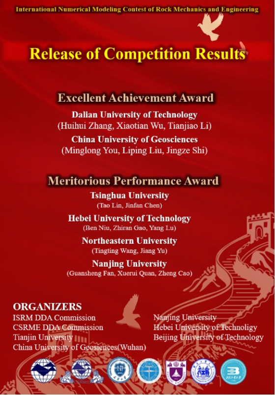 本次大赛由国际岩石力学与岩石工程学会非连续变形分析专委会(ISRM DDA)联合中国岩石力学与工程学会岩土体非连续变形分析专委会(CSRME DDA)及sunbet官方网站(武汉)、天津大学、南京大学、北京工业大学、河北工业大学等多所高校联合举办,于2021年第十一届亚洲岩石力学大会(ARMS11)期间同步举行。大赛鼓励研究生对岩石力学问题的现有数值方法和软件进行公开、透明和广泛的验证,为共享岩石力学问题的实验和数值结果提供平台。