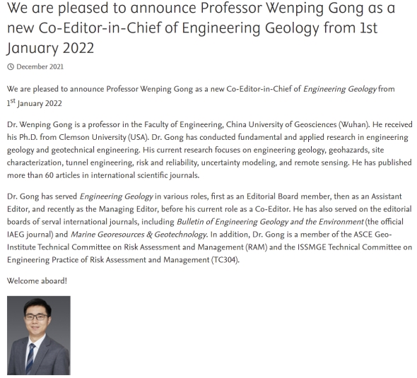 (通讯员:黄静)近日,sunbet龚文平教授受邀担任国际期刊Engineering Geology共同主编(Co-Editor-in-Chief)。龚文平教授的此次任职将有助于促进公司在工程地质相关领域与国内外学者的交流合作,并提升公司在工程地质相关领域的国际影响力。