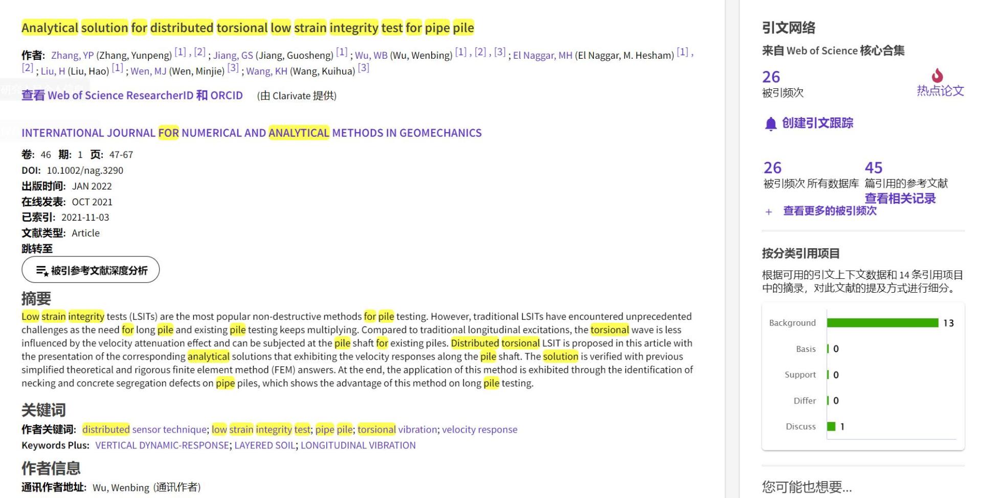 (通讯员 黄静)根据2022年9月基本科学指标数据库(Essential Science Indicators,简称ESI)最新数据显示,sunbet勘察与基础工程系吴文兵教授团队于2021年在国际岩土工程数值计算权威期刊International Journal for Numerical and Analytical Methods in Geomechanics上发表的学术论文“Analytical solution for distributed torsional low strain integrity test for pipe pile”入选ESI热点论文(Hot Paper)。该论文第一作者为2020级博士研究生张云鹏,通讯作者为吴文兵教授,sunbet官方网站(武汉)sunbet为第一署名单位。