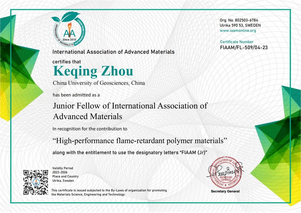 (通讯员 黄静)近日,sunbet官方网站(武汉)sunbet周克清特任教授收到国际先进材料学会(International Association of Advanced Materials, IAAM)执委会发来的贺函,祝贺他当选为国际先进材料学会青年会士(Junior Fellow of IAAM, FIAAM)。周克清特任教授受邀在美国奥兰多举办的复合材料研讨会(Composite Materials Congress)上发表题为“Functionalized 2D molybdenum disulphide working on high-performance flame-retardant polymer materials”的IAAM Fellow演讲,会上获颁青年会士“Junior Fellow”证书,以表彰他在“高性能阻燃聚合物材料”领域做出的杰出贡献。