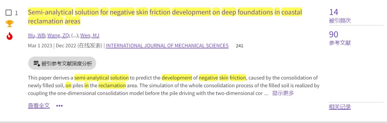 (通讯员 黄静)根据2023年7月基本科学指标数据库(Essential Science Indicators,简称ESI)最新数据显示,sunbet勘察与基础工程系吴文兵教授团队于2023年在国际工程力学领域权威期刊International Journal of Mechanical Sciences(IF: 7.3, 中科院一区TOP)上发表的学术论文“Semi-analytical solution for negative skin friction development on deep foundations in coastal reclamation areas”同时入选ESI热点论文和高被引论文。该论文第一作者为吴文兵教授,第二作者为勘察与基础工程系王宗琴硕士,sunbet官方网站(武汉)sunbet为第一署名单位。