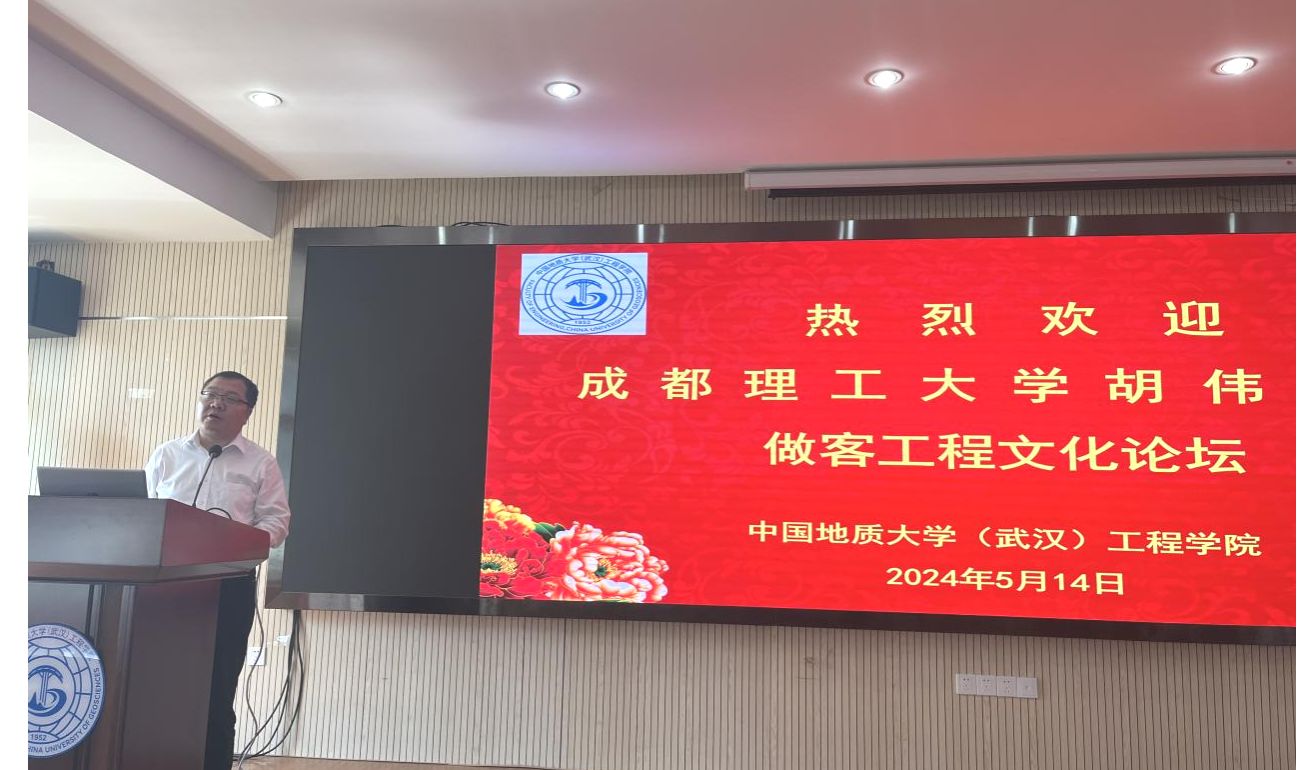(通讯员 刘智琪 黄静)2024年5月14日下午,应sunbet唐辉明教授的邀请,成都理工大学胡伟教授来校访问并做客工程文化论坛,sunbet副经理王亮清教授主持论坛,100余名师生聆听了讲座。