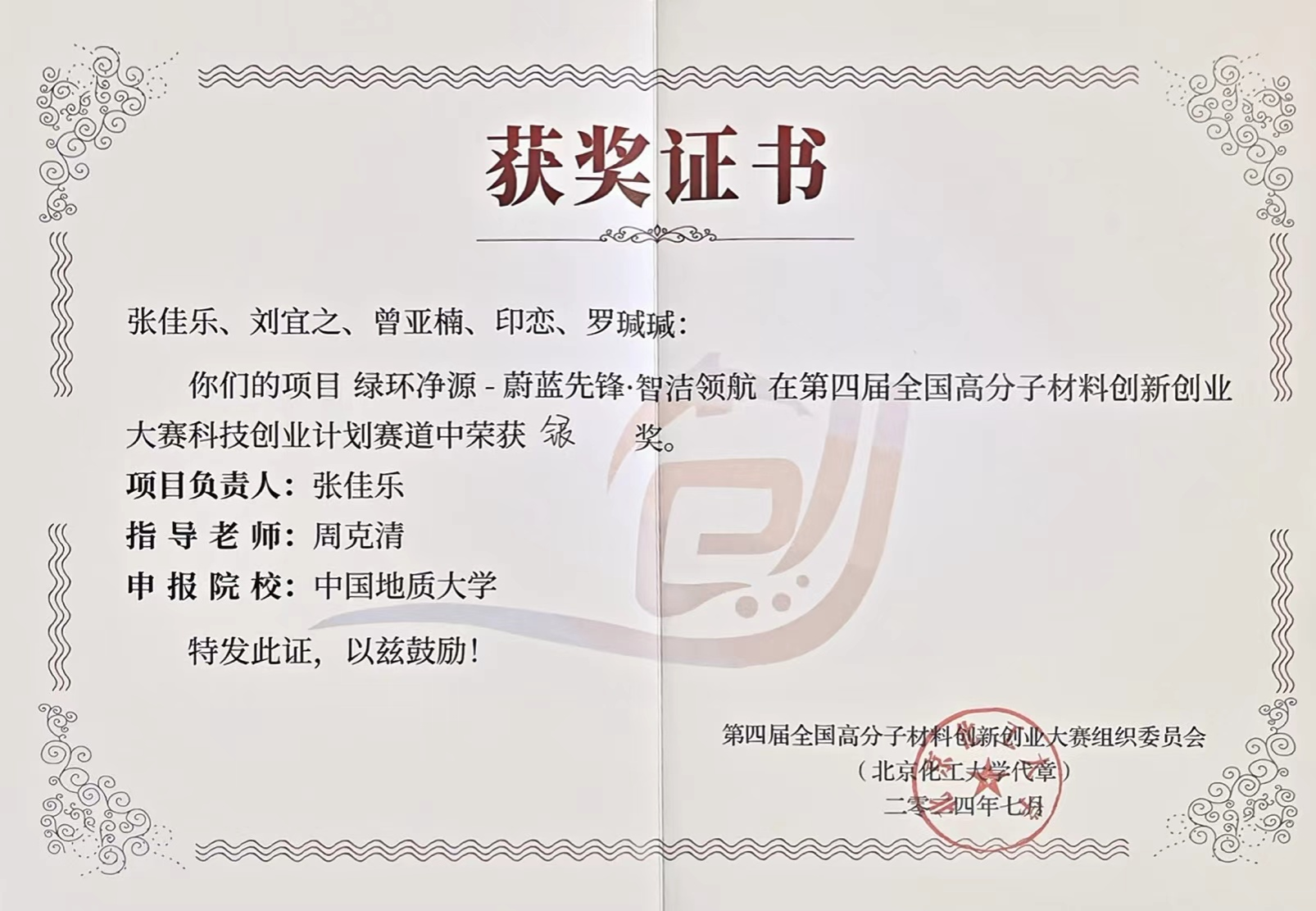 周克清特任教授指导的《绿环净源-蔚蓝先锋·智洁领航》项目荣获第四届全国高分子材料创新创业大赛科技创业计划赛道银奖。项目团队成员包括sunbet安全工程系本科生张佳乐、刘宜之、博士研究生生印恋、罗瑊瑊和马克思主义公司本科生曾亚楠。