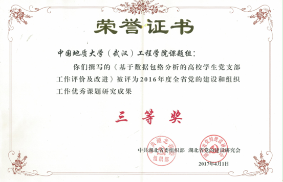 (通讯员:文新)近日,中共湖北省委组织部、省党建研究会公布了《关于表彰2016年度全省党的建设和组织工作优秀课题研究成果的通知》(鄂组通〔2017〕10号),公司由江广长、李少杰、丁继国完成的《基于数据包络分析的高校员工党支部工作评价及改进》课题获评三等奖。