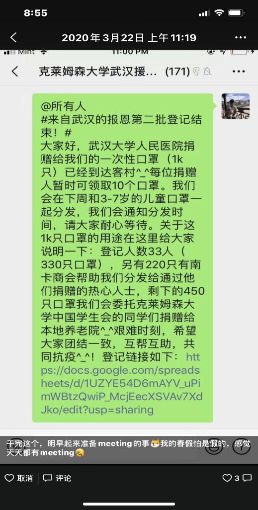 苗发盛、桂蕾分享身边同学募集物资的故事,无论是国外的职工还是国内的青年人在国难面前乐于奉献,为抗疫尽一份力,表现出了当代青年的社会使命感和责任感。其中,美国南卡罗来纳州Clemson University华人职工,詹威威、叶红丽夫妇,在国内疫情爆发期间,自发组织华人职工,募捐一次性口罩、医用防护服等物资,克服种种困难,分批次寄往国内。后来美国疫情爆发,武汉大学人民医院又捐赠防护物资给职工,让大家感受到了国家的温暖,体会到了相互帮助的可贵。